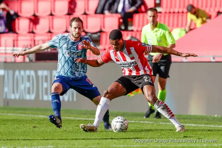 Het was geen hoogstaande, doch wel boeiende topper. Ajax begon sterk in het Philips Stadion waar Jordan Teze een inzet van Devyne Rensch nog net voor de lijn kon wegglijden. Naarmate de wedstrijd vordert komt PSV beter in het spel en dat levert een kans op voor aanvoerder Dumfries die gehinderd door Timber niet tot scoren komt. Dat lukt even later Eran Zahavi wel door een vrije trap over de muur en langs keeper Stekelenburg te krullen.